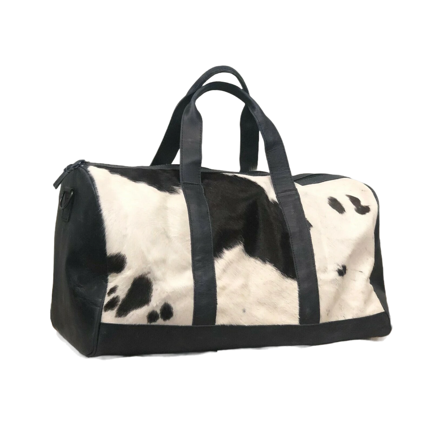 - Cowhide with black leather duffel bag.