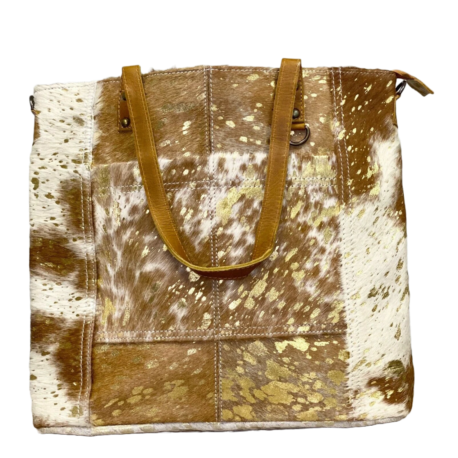 - White and brown cowhide shoulder purse.