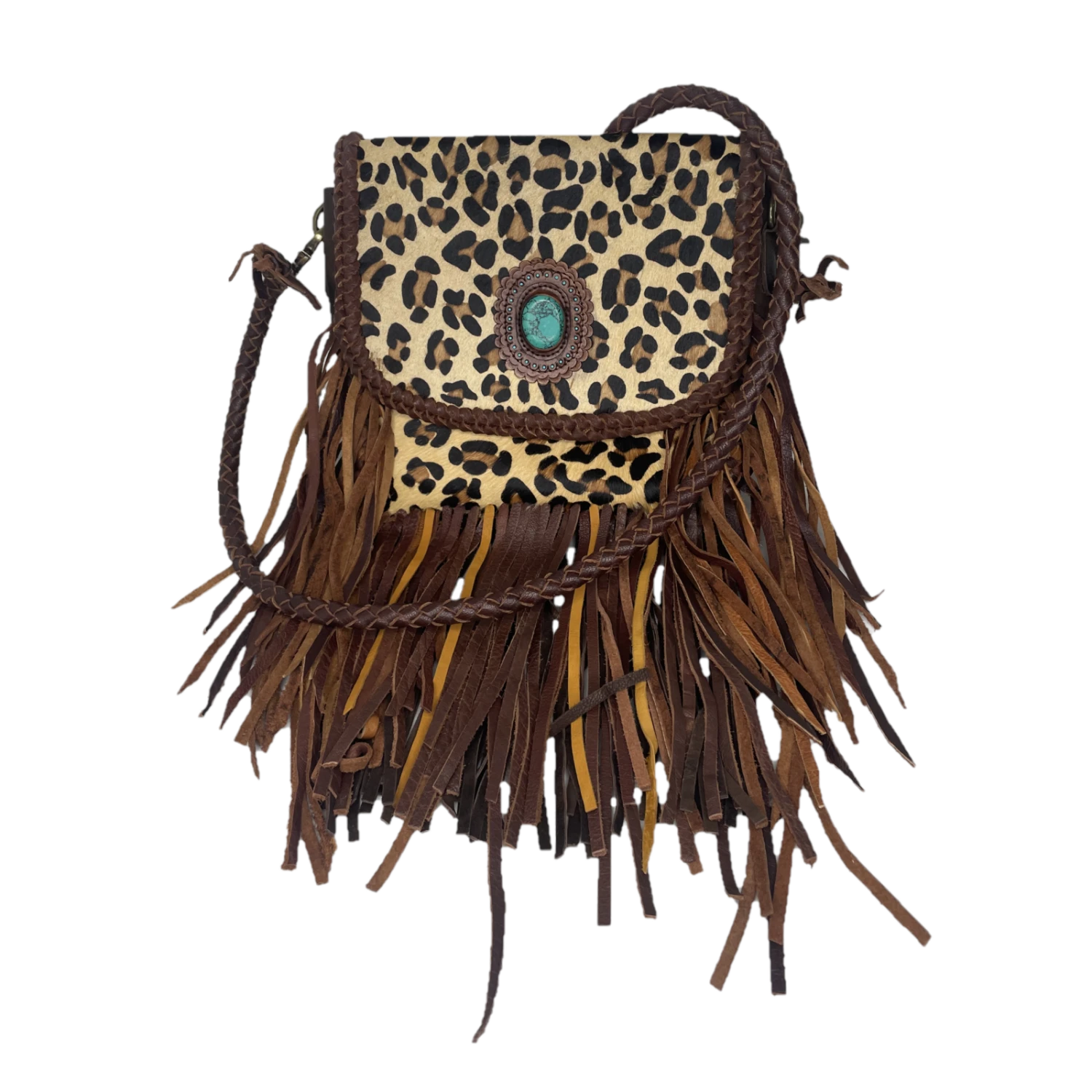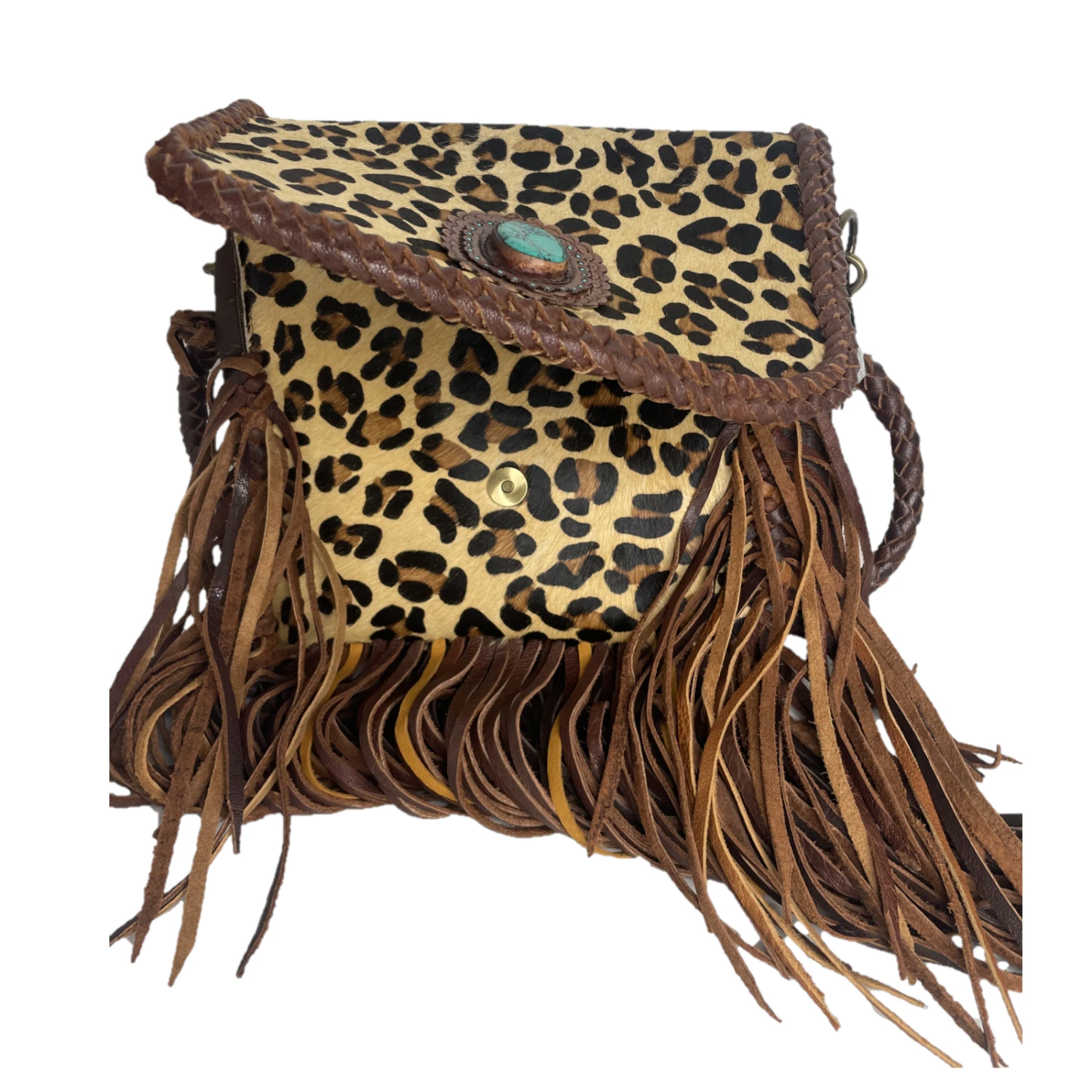 - Turquoise concho accent on the front flap of bag.