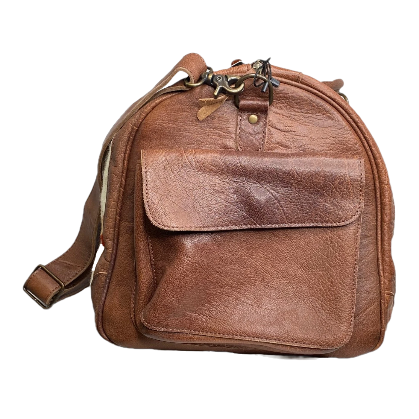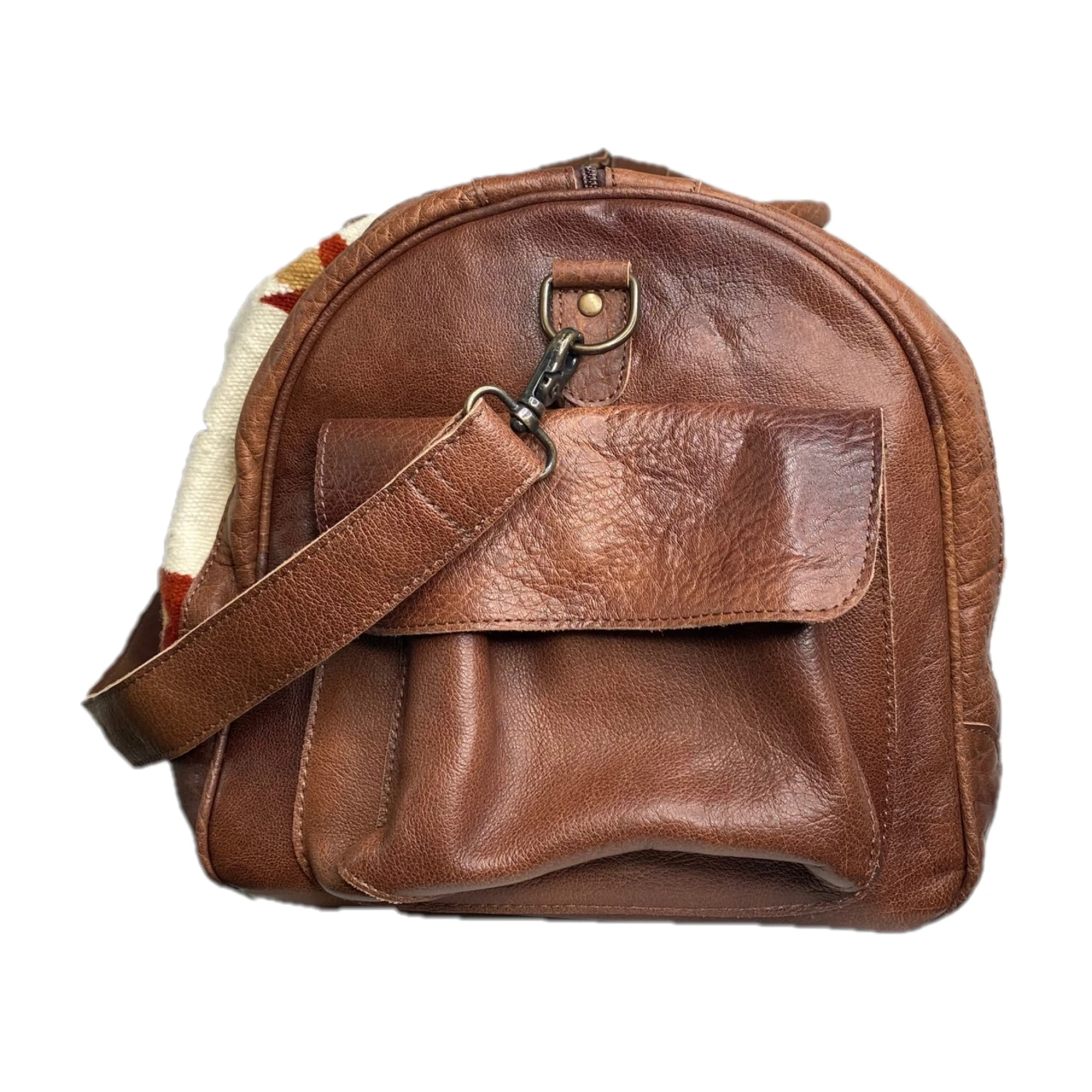 - Brown leather and white aztec print duffle bag.