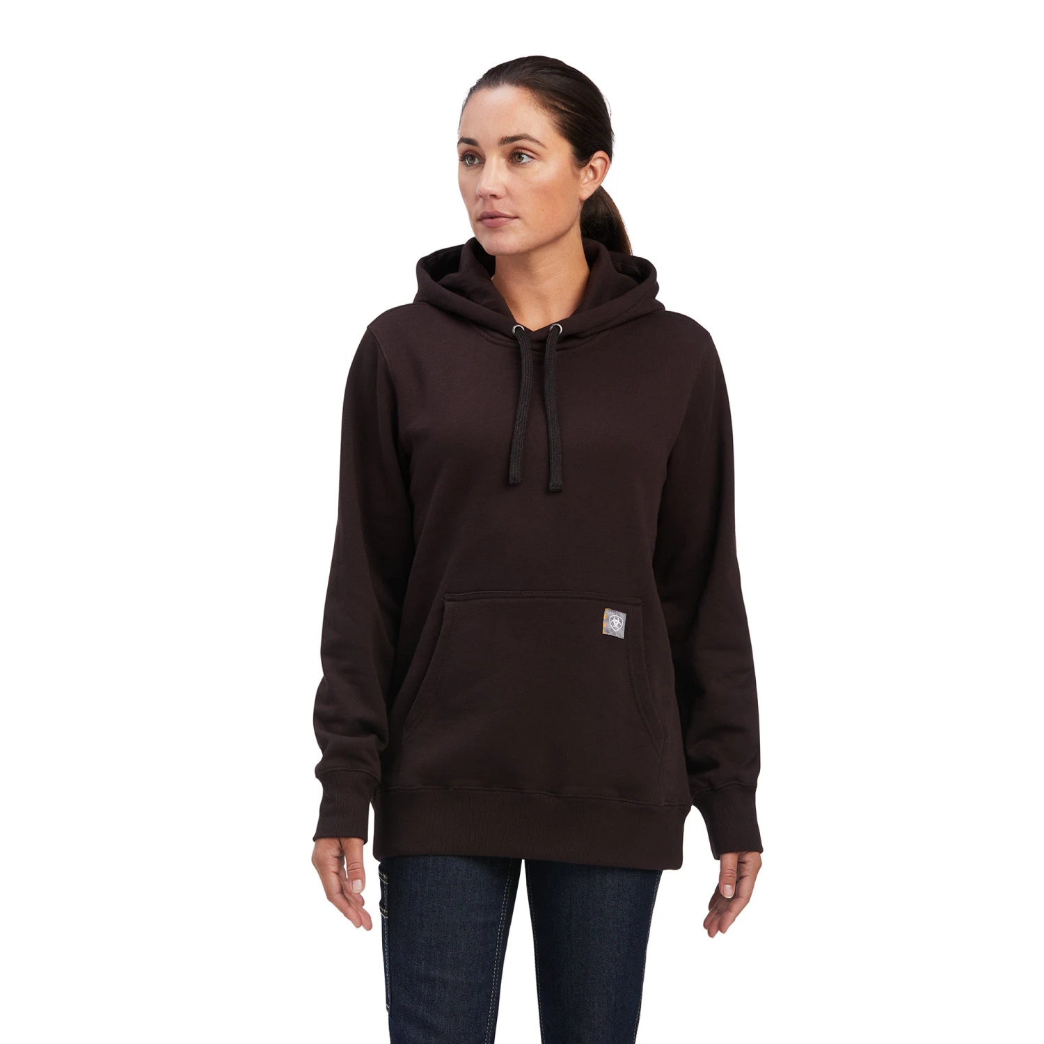 - Ariat logo tag on kangaroo pocket.