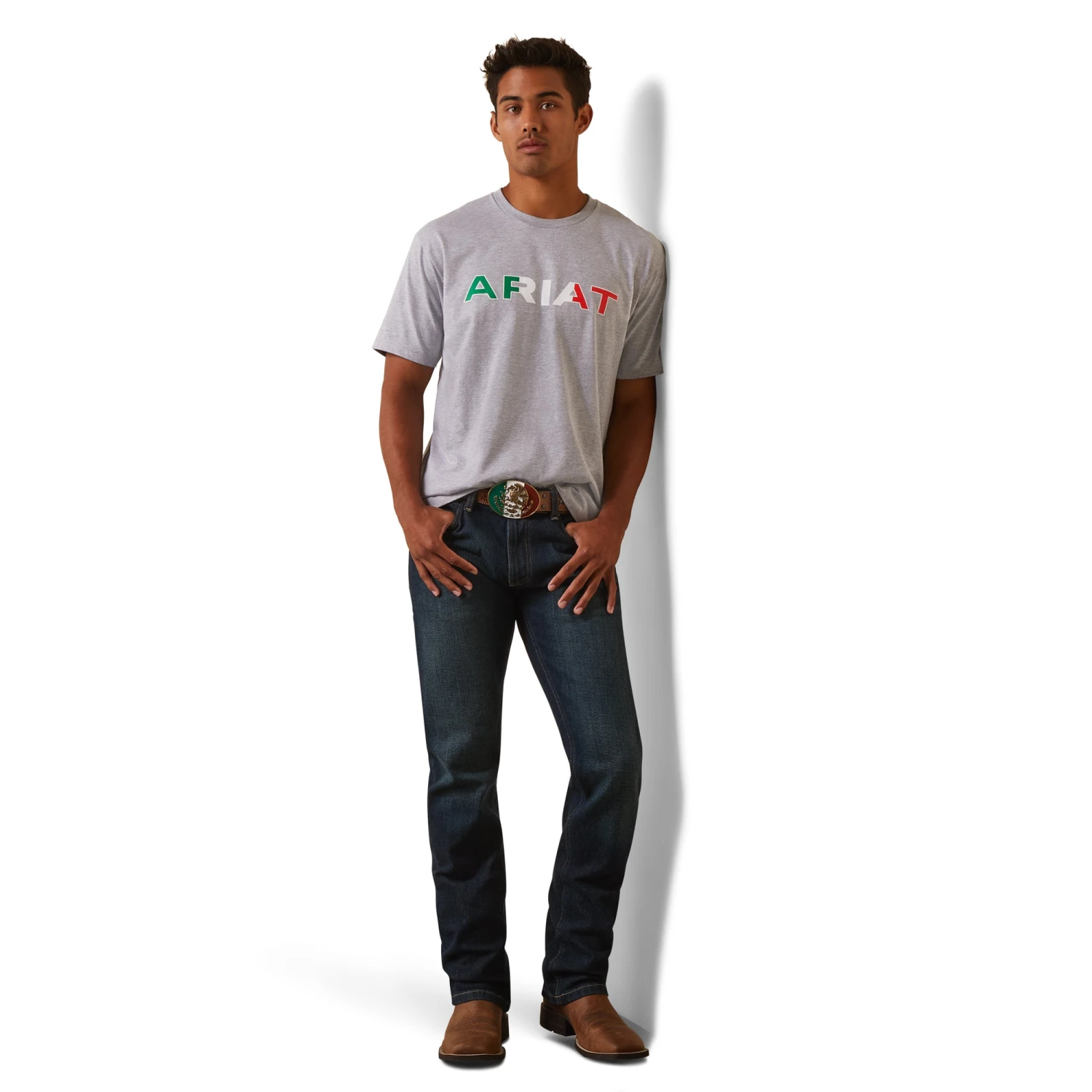 - Mexican flag Ariat logo on chest.