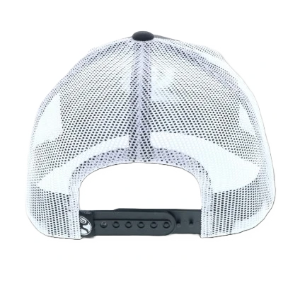 - Black cotton twill front and white mesh back.