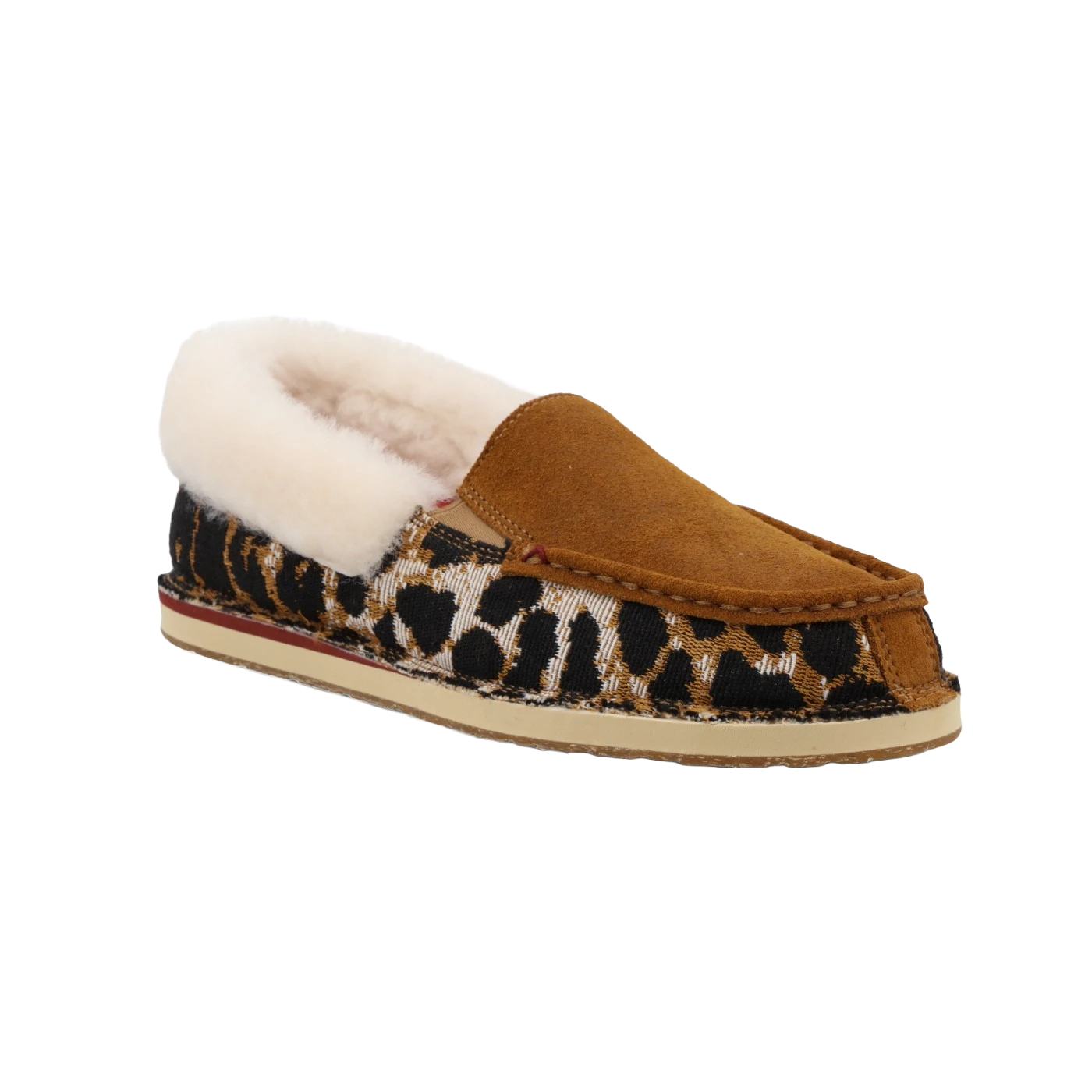 - Tan and cheetah slip on shoes.